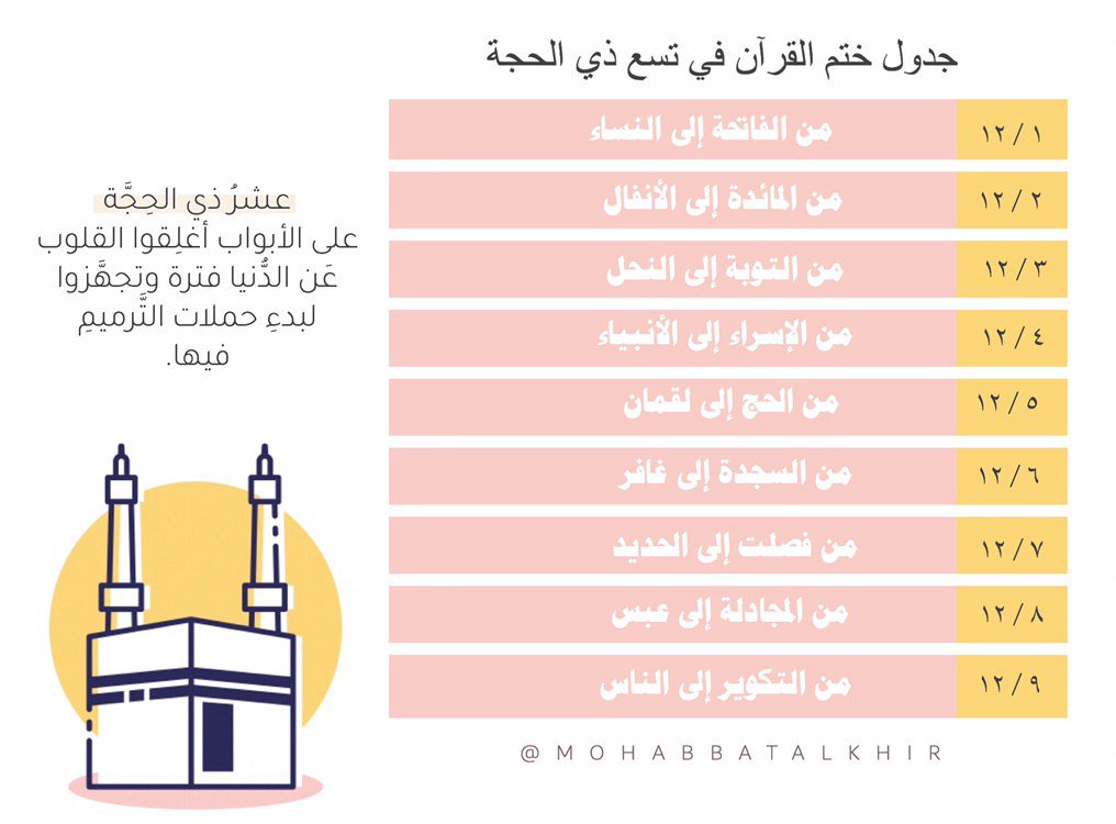 فريق محبات الخير Ar Twitter عشر ذي الحجة على الأبواب أغلقوا القلوب عن الدنيا فترة وتجهزوا لبدء حملات الترميم فيها جدول ختم القرآن في تسع ذي الحجة محبات الخير Betaqadaawia Https T Co Iqdo0mvego Https T Co Tgcehj0guw