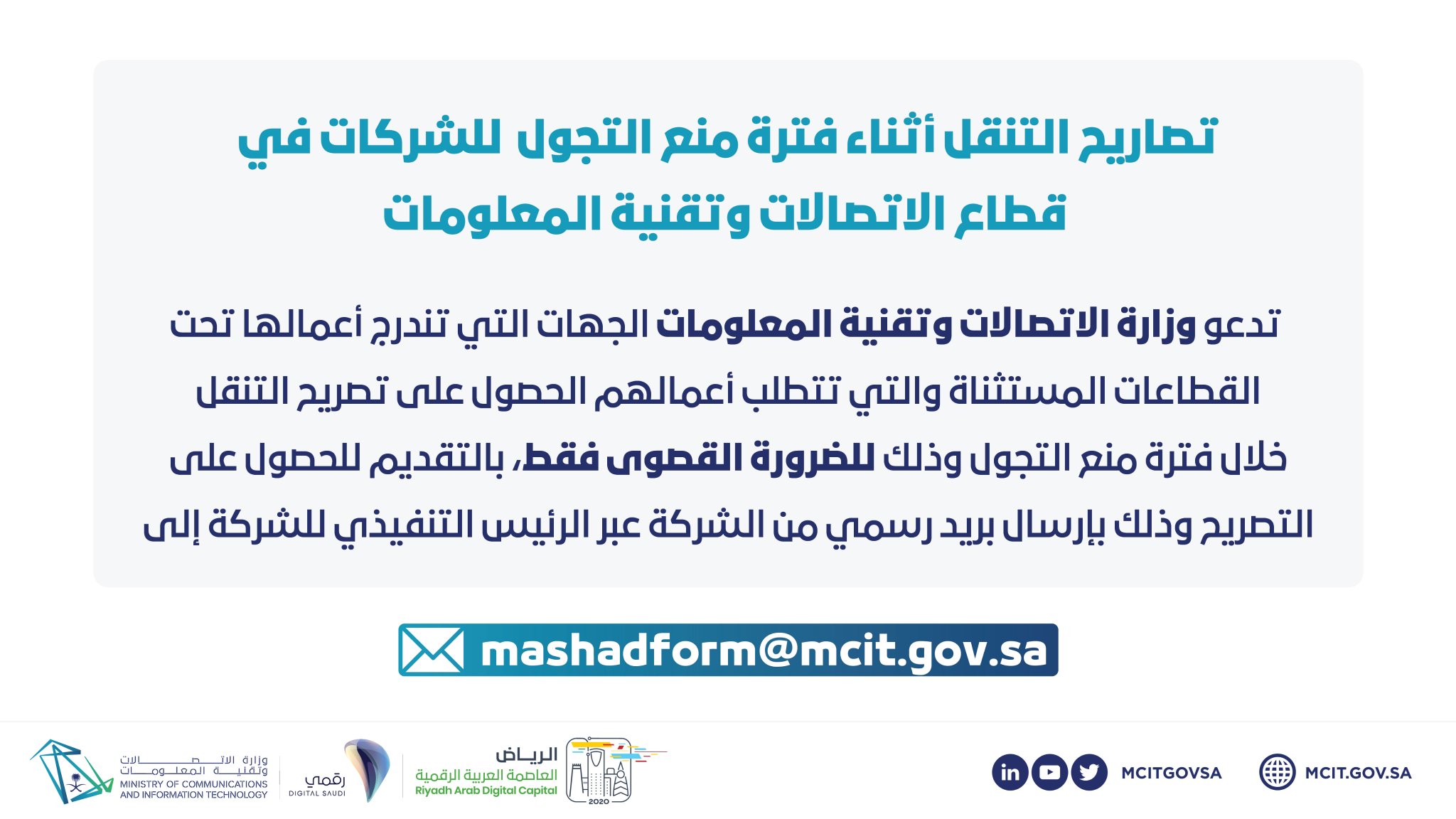 وزارة الاتصالات وتقنية المعلومات Twitterissa تزامن ا مع التوجيهات باعتماد نموذج موحد لتصريح التنقل داخل المدن ندعو منسوبي الشركات في قطاع الاتصالات وتقنية المعلومات إلى استكمال متطلبات استخراج تصاريح الاستثناء من حظر التجول